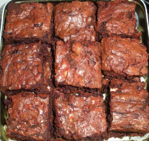 The top should be firm but the inside should feel soft when cooked. Allow to cool in the tin. Remove the brownies from the tin and cut into squares. This recipe will make about 20 brownies.