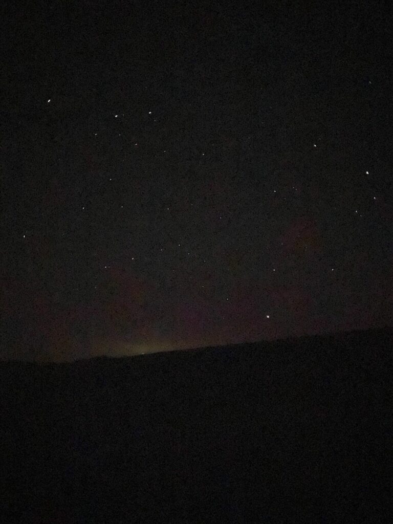 Night, again. The dog asks to go out but then just drags me to the gate to look out at the moor. I take a time lapse photo with my phone that looks like a Victorian postcard of the stars.