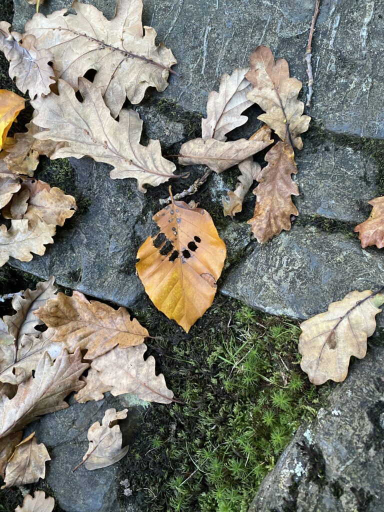 When you are with small children, everything is treasure. We make acorn-cup boats and race them down the river. We wash our hands with sand, and dry them on moss. We pocket particularly big or spherical galls. Splosh in the river with gay abandon — if your socks get wet, someone will hand you new ones. Sensory feedback, crunching, crisping. Throwing rocks into the river, and speculating what noise they will make. I think this one is going to go THUNK. Little love thinks it will go BLOSH.