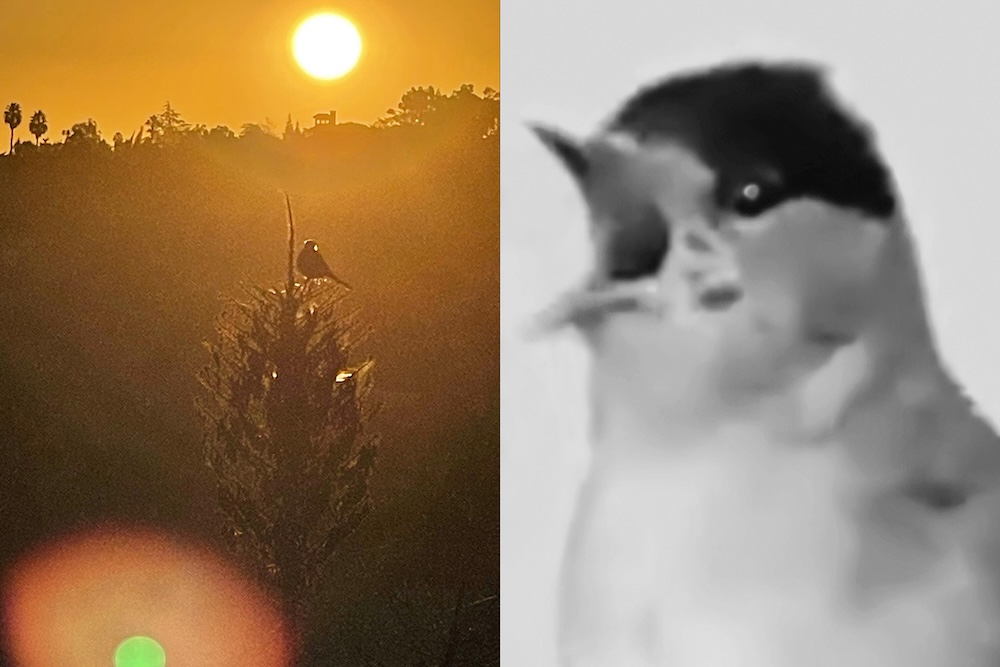 He’s beautiful, he’s fine, he was impatient and arrived a bit early, but in the dystopian La La Land of big pharma and insurance profit ‘it’s better to be absolutely sure.’ He’s in good hands, but not ours. Below I follow the shadow of an American crow slipping across sun blasted walls, as sharp and as black as the bird casting it. I’m startled by a tiny projectile that’s just suddenly rocketed straight up from somewhere below and stopped unnaturally dead still right out in front of me. Before it registers, it’s a small drone spying into the apartments; but it is silent. Then near-ultrasonic peeps emanate from it: it’s a hummingbird, displaying. I don’t know if it’s Allen’s Selasphorus sasin, or Anna’s Calypte anna. It disappears again at warp speed. But whichever, I can add it to my garden-balcony-bird count, now listing a pair of peregrines, red tailed hawk, black vulture and sharp shinned hawk, which could have been a Cooper’s hawk, they are very similar; a pair of ravens aerially courting. Down in the tree-lined streets and shrubbed-up yards: black phoebes, yellow rumped warblers, house finches.